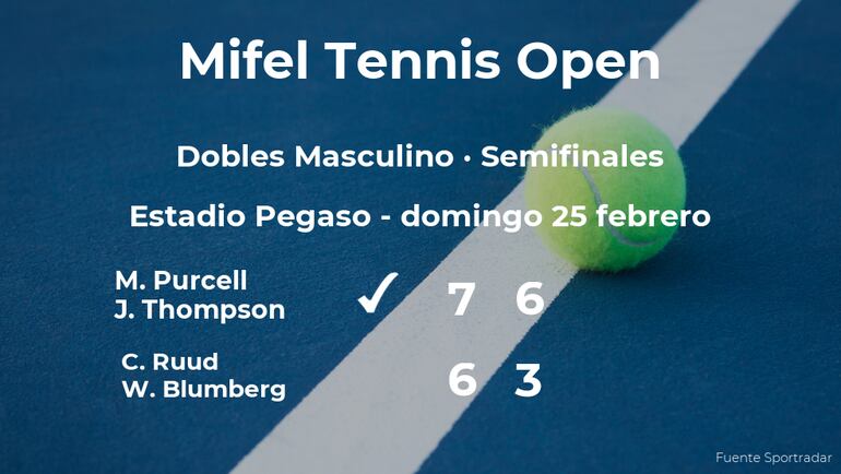 Los australianos Max Purcell y Jordan Thompson, número 51 de la ATP y, número 40 de la ATP respectivamente vencieron por 7(7)-6(1) y 6-3 al jugador noruego Casper Ruud y al tenista estadounidense William Blumberg en las semifinales del torneo de Los Cabos. Con este resultado, podremos seguir viendo a la pareja ganadora en la siguiente fase del torneo de Los Cabos.