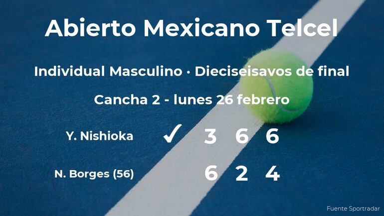 El tenista japonés Yoshihito Nishioka ganó por 3-6, 6-2 y 6-4 a Nuno Borges, número 56 de la ATP, en los dieciseisavos de final del torneo de Acapulco. Con este resultado, seguiremos viendo al vencedor del partido en los octavos de final del torneo de Acapulco.