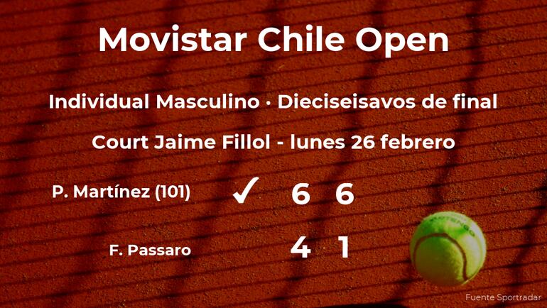 El tenista español Pedro Martínez, número 101 de la ATP, venció por 6-4 y 6-1 a Francesco Passaro, tenista italiano en los dieciseisavos de final del torneo de Santiago. Tras este resultado, Martínez consigue la plaza para los octavos de final del torneo de Santiago.
