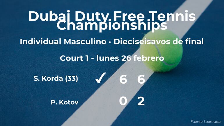 El jugador estadounidense Sebastian Korda, número 33 de la ATP, venció por 6-0 y 6-2 a Pavel Kotov, tenista ruso en los dieciseisavos de final del torneo de Dubai. Con este resultado, el ganador estará en los octavos de final del torneo de Dubai.