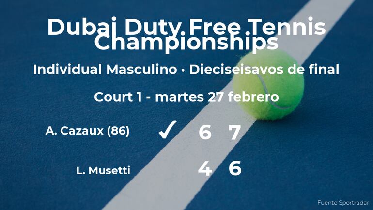 El tenista francés Arthur Cazaux, número 86 de la ATP, ganó en los dieciseisavos de final del torneo de Dubai por 6-4 y 7(7)-6(2) al jugador italiano Lorenzo Musetti. Con este resultado, veremos al vencedor del partido en la siguiente fase del torneo de Dubai, los octavos de final.