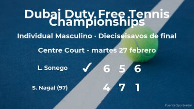 El tenista italiano Lorenzo Sonego venció por 6-4, 5-7 y 6-1 a Sumit Nagal, tenista indio, número 97 de la ATP, en los dieciseisavos de final del torneo de Dubai. Con este resultado, seguiremos viendo al vencedor del partido en los octavos de final del torneo de Dubai.