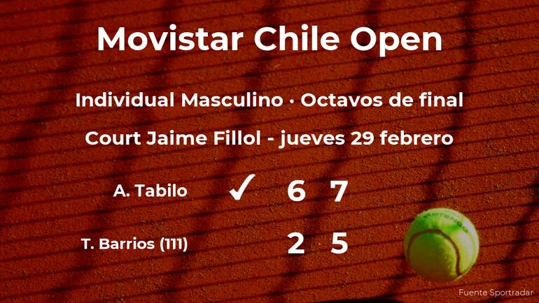 Alejandro Tabilo y cabeza de serie número 4, ganó por 6-2 y 7-5 a Tomás Barrios, tenista, número 111 de la ATP, en los octavos de final del torneo de Santiago. Con este resultado, seguiremos de cerca la trayectoria del jugador en la siguiente ronda de la competición.