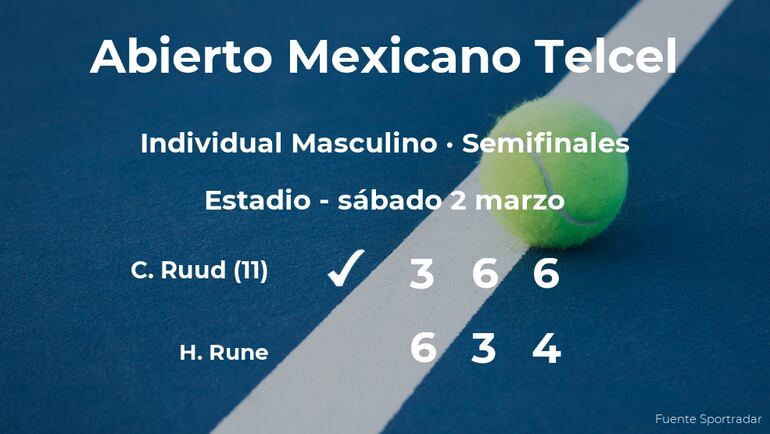 El tenista noruego Casper Ruud, número 11 de la ATP y cabeza de serie número 6, venció en las semifinales del torneo de Acapulco por 3-6, 6-3 y 6-4 a Holger Rune y cabeza de serie número 2. Con este resultado, Ruud estará en la siguiente ronda del torneo de Acapulco.