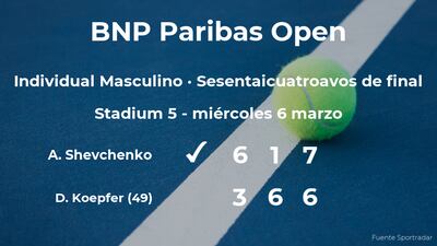 El tenista kazajo Alexander Shevchenko venció en los sesentaicuatroavos de final del torneo de Indian Wells por 6-3, 1-6 y 7(7)-6(3) a Dominik Koepfer, tenista, número 49 de la ATP. Tras este resultado, seguiremos viendo al vencedor del partido en la siguiente fase del torneo de Indian Wells, los treintaidosavos de final.