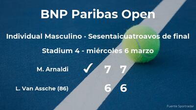 Matteo Arnaldi, italiano ganó en los sesentaicuatroavos de final del torneo de Indian Wells por 7(8)-6(6) y 7(7)-6(3) al tenista francés Luca Van Assche, número 86 de la ATP. Tras este resultado, seguiremos viendo al ganador del partido en los treintaidosavos de final del torneo de Indian Wells.