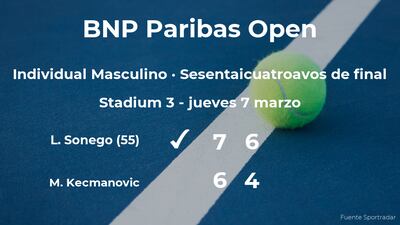 El italiano Lorenzo Sonego, número 55 de la ATP, ganó por 7(7)-6(1) y 6-4 a Miomir Kecmanovic, tenista serbio en los sesentaicuatroavos de final del torneo de Indian Wells. Con este resultado, seguiremos viendo al ganador del partido en la siguiente fase del torneo de Indian Wells, los treintaidosavos de final.
