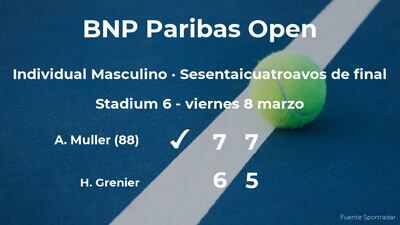 Alexandre Muller, francés, número 88 de la ATP, ganó en los sesentaicuatroavos de final del torneo de Indian Wells por 7(7)-6(5) y 7-5 a Hugo Grenier, tenista francés. Tras este resultado, seguiremos de cerca la trayectoria del jugador en los treintaidosavos de final de la competición.