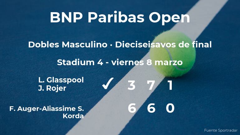 El británico Lloyd Glasspool y Jean-Julien Rojer vencieron por 3-6, 7(7)-6(4) y 1-0 (tras un desempate a 10 puntos en el tercer set) al jugador canadiense Félix Auger-Aliassime y al tenista estadounidense Sebastian Korda, números 31 y 29 de la ATP en los dieciseisavos de final del torneo de Indian Wells. Con este resultado, la pareja consigue la plaza para los octavos de final del torneo de Indian Wells.