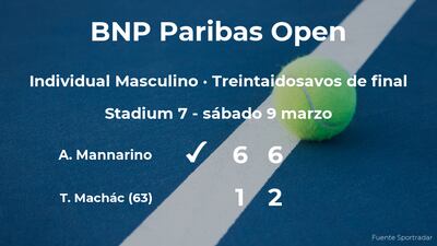 El jugador francés Adrian Mannarino y cabeza de serie número 21, ganó por 6-1 y 6-2 al tenista checo Tomáš Machác, número 63 de la ATP, en los treintaidosavos de final del torneo de Indian Wells. Tras este resultado, el francés consigue clasificarse para los dieciseisavos de final del torneo de Indian Wells.