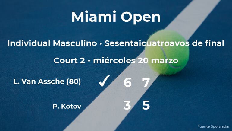 Luca Van Assche, francés, número 80 de la ATP, venció en los sesentaicuatroavos de final del torneo de Miami Gardens por 6-3 y 7-5 al jugador ruso Pavel Kotov. Tras este resultado, seguiremos viendo al vencedor del partido en la siguiente fase del torneo de Miami Gardens, los treintaidosavos de final.