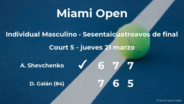 El tenista kazajo Alexander Shevchenko venció por 6(4)-7(7), 7(7)-6(4) y 7-5 a Daniel Galán, tenista colombiano, número 84 de la ATP, en los sesentaicuatroavos de final del torneo de Miami Gardens. Con este resultado, podremos seguir viendo al ganador del partido en la siguiente fase del torneo de Miami Gardens, los treintaidosavos de final.