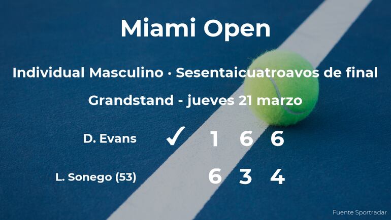 Daniel Evans, británico ganó en los sesentaicuatroavos de final del torneo de Miami Gardens por 1-6, 6-3 y 6-4 al italiano Lorenzo Sonego, número 53 de la ATP. Con este resultado, seguiremos de cerca la trayectoria del jugador en los treintaidosavos de final del campeonato.
