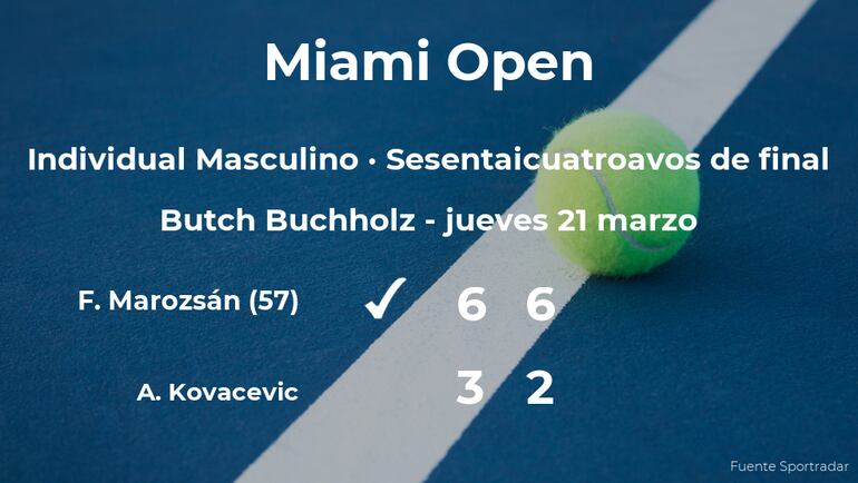 Fábián Marozsán, húngaro, número 57 de la ATP, ganó por 6-3 y 6-2 al estadounidense Aleksandar Kovacevic en los sesentaicuatroavos de final del torneo de Miami Gardens. Tras este resultado, seguiremos viendo al vencedor del partido en los treintaidosavos de final del torneo de Miami Gardens.
