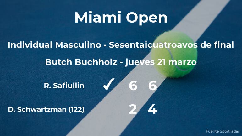 Roman Safiullin, ruso ganó en los sesentaicuatroavos de final del torneo de Miami Gardens por 6-2 y 6-4 a Diego Schwartzman, tenista argentino, número 122 de la ATP. Con este resultado, el ganador estará en los treintaidosavos de final del torneo de Miami Gardens.