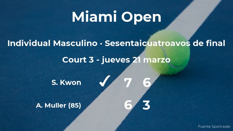 El surcoreano Soonwoo Kwon ganó en los sesentaicuatroavos de final del torneo de Miami Gardens por 7(7)-6(3) y 6-3 al tenista francés Alexandre Muller, número 85 de la ATP. Con este resultado, podremos seguir viendo al vencedor del partido en la siguiente fase del torneo de Miami Gardens, los treintaidosavos de final.