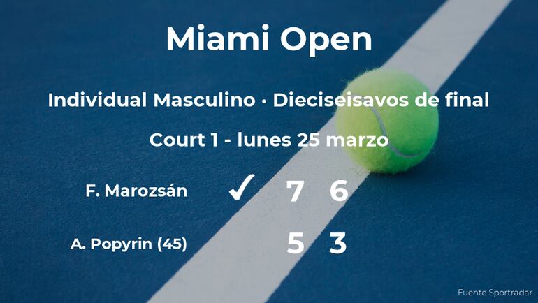 El jugador húngaro Fábián Marozsán ganó en los dieciseisavos de final del torneo de Miami Gardens por 7-5 y 6-3 a Alexei Popyrin, tenista australiano, número 45 de la ATP. Con este resultado, seguiremos de cerca la trayectoria del jugador en los octavos de final del torneo.