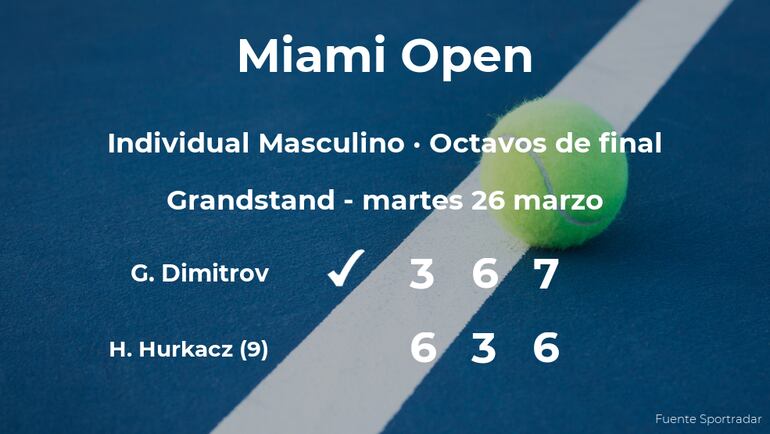 Grigor Dimitrov, y cabeza de serie número 11, venció en los octavos de final del torneo de Miami Gardens por 3-6, 6-3 y 7(7)-6(3) a Hubert Hurkacz, tenista polaco, número 9 de la ATP y cabeza de serie número 8. Tras este resultado, veremos al vencedor del partido en la siguiente ronda del torneo de Miami Gardens.