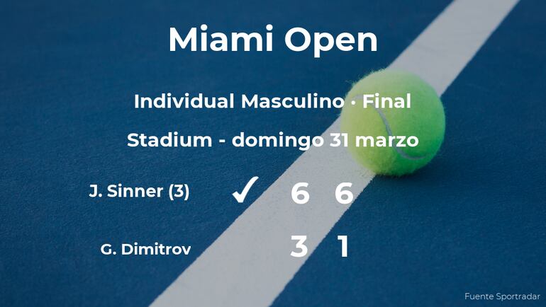 El tenista italiano Jannik Sinner, número 3 de la ATP y cabeza de serie número 2, venció en la final del torneo de Miami Gardens por 6-3 y 6-1 a Grigor Dimitrov y cabeza de serie número 11. Tras este resultado, el jugador es el nuevo campeón del torneo de Miami Gardens.