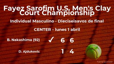 El estadounidense Brandon Nakashima, número 92 de la ATP, ganó por 6-1 y 6-4 a Duje Ajdukovic, tenista en los dieciseisavos de final del torneo de Houston. Con este resultado, el tenista estadounidense logra clasificarse para los octavos de final del torneo de Houston.