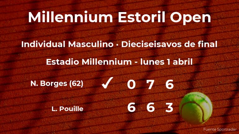 Nuno Borges, número 62 de la ATP, venció en los dieciseisavos de final del torneo de Estoril por 0-6, 7(8)-6(6) y 6-3 a Lucas Pouille, tenista francés. Con este resultado, veremos al ganador del partido en los octavos de final del torneo de Estoril.