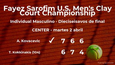 Aleksandar Kovacevic, estadounidense ganó por 7(7)-6(3), 6(2)-7(7) y 6-4 al tenista australiano Thanasi Kokkinakis, número 104 de la ATP, en los dieciseisavos de final del torneo de Houston. Con este resultado, Kovacevic estará en los octavos de final del torneo de Houston.