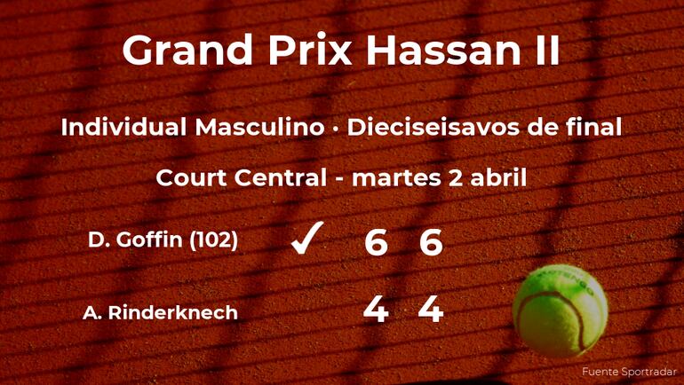 El tenista belga David Goffin, número 102 de la ATP, venció en los dieciseisavos de final del torneo de Marrakech por 6-4 y 6-4 a Arthur Rinderknech, tenista francés. Con este resultado, seguiremos viendo al ganador del partido en la siguiente fase del torneo de Marrakech, los octavos de final.