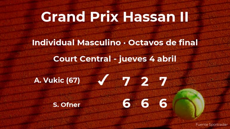 El tenista australiano Aleksandar Vukic, número 67 de la ATP, venció por 7(13)-6(11), 2-6 y 7(9)-6(7) a Sebastian Ofner, tenista austriaco y cabeza de serie número 2, en los octavos de final del torneo de Marrakech. Con este resultado, seguiremos de cerca la trayectoria del jugador en la siguiente fase del campeonato.