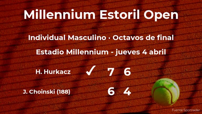 Hubert Hurkacz, polaco y cabeza de serie número 2, venció por 7(7)-6(5) y 6-4 al tenista británico Jan Choinski, número 188 de la ATP, en los octavos de final del torneo de Estoril. Tras este resultado, podremos seguir viendo al vencedor del partido en la siguiente fase del torneo de Estoril.