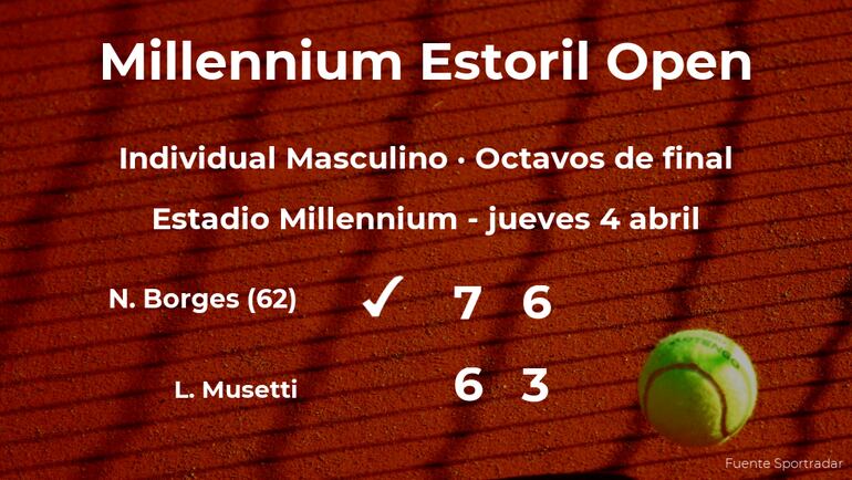 Nuno Borges,, número 62 de la ATP, ganó en los octavos de final del torneo de Estoril por 7(7)-6(4) y 6-3 al tenista italiano Lorenzo Musetti y cabeza de serie número 3. Con este resultado, veremos al ganador del partido en la siguiente fase del torneo de Estoril, la siguiente fase.