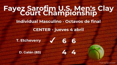Tomás Etcheverry, argentino y cabeza de serie número 4, venció por 6-4 y 6-4 al colombiano Daniel Galán, número 83 de la ATP, en los octavos de final del torneo de Houston. Con este resultado, seguiremos viendo al vencedor del partido en la siguiente fase del torneo de Houston, la siguiente fase.