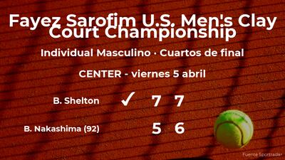 El tenista estadounidense Ben Shelton y cabeza de serie número 1, venció por 7-5 y 7(11)-6(9) a Brandon Nakashima, tenista estadounidense, número 92 de la ATP, en los cuartos de final del torneo de Houston. Con este resultado, veremos al ganador del partido en la siguiente ronda del torneo de Houston.