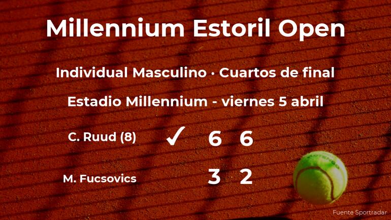 El jugador noruego Casper Ruud, número 8 de la ATP y cabeza de serie número 1, ganó en los cuartos de final del torneo de Estoril por 6-3 y 6-2 a Márton Fucsovics, tenista húngaro. Tras este resultado, el ganador estará en la siguiente fase del torneo de Estoril.