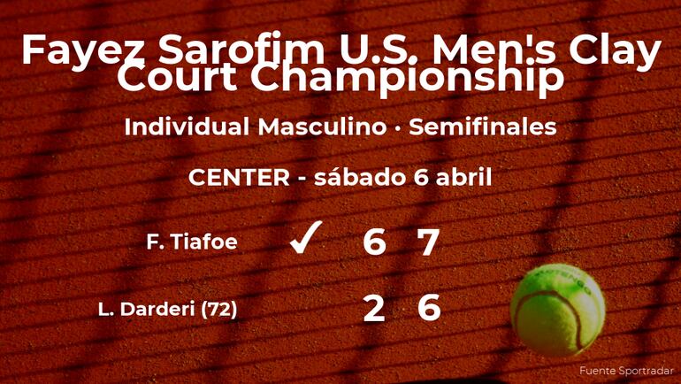 Frances Tiafoe, estadounidense y cabeza de serie número 3, ganó en las semifinales del torneo de Houston por 6-2 y 7(7)-6(2) a Luciano Darderi, tenista italiano, número 72 de la ATP. Con este resultado, Tiafoe consigue el puesto para la siguiente ronda del torneo de Houston.