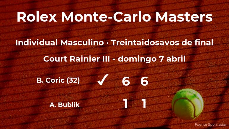 Borna Coric,, número 32 de la ATP, ganó por 6-1 y 6-1 al kazajo Alexander Bublik y cabeza de serie número 16, en los treintaidosavos de final del torneo de Monte Carlo. Tras este resultado, podremos seguir viendo al vencedor del partido en los dieciseisavos de final del torneo de Monte Carlo.