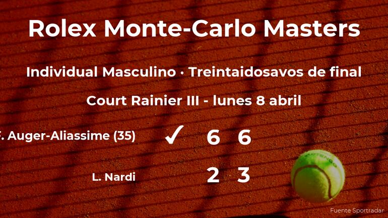 El jugador canadiense Félix Auger-Aliassime, número 35 de la ATP, ganó en los treintaidosavos de final del torneo de Monte Carlo por 6-2 y 6-3 al tenista italiano Luca Nardi. Con este resultado, el canadiense logra clasificarse para los dieciseisavos de final del torneo de Monte Carlo.