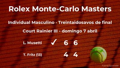El jugador italiano Lorenzo Musetti ganó por 6-4 y 6-4 al jugador estadounidense Taylor Fritz, número 13 de la ATP y cabeza de serie número 13, en los treintaidosavos de final del torneo de Monte Carlo. Con este resultado, el italiano logra clasificarse para los dieciseisavos de final del torneo de Monte Carlo.