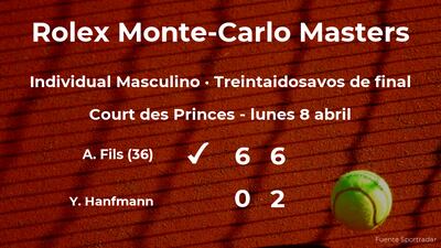 El jugador francés Arthur Fils, número 36 de la ATP, ganó por 6-0 y 6-2 a Yannick Hanfmann en los treintaidosavos de final del torneo de Monte Carlo. Tras este resultado, veremos al ganador del partido en los dieciseisavos de final del torneo de Monte Carlo.