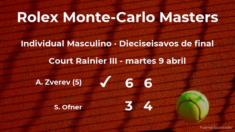 Alexander Zverev,, número 5 de la ATP y cabeza de serie número 5, ganó por 6-3 y 6-4 a Sebastian Ofner, tenista austriaco en los dieciseisavos de final del torneo de Monte Carlo. Con este resultado, seguiremos viendo al vencedor del partido en la siguiente fase del torneo de Monte Carlo, los octavos de final.