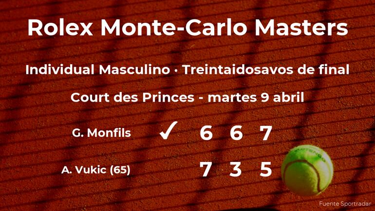 Gaël Monfils, francés ganó por 6(7)-7(9), 6-3 y 7-5 a Aleksandar Vukic, tenista australiano, número 65 de la ATP, en los treintaidosavos de final del torneo de Monte Carlo. Con este resultado, podremos seguir viendo al vencedor del partido en los dieciseisavos de final del torneo de Monte Carlo.