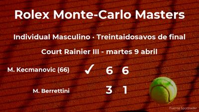 Miomir Kecmanovic, serbio, número 66 de la ATP, ganó en los treintaidosavos de final del torneo de Monte Carlo por 6-3 y 6-1 al jugador italiano Matteo Berrettini. Con este resultado, el ganador estará en los dieciseisavos de final del torneo de Monte Carlo.