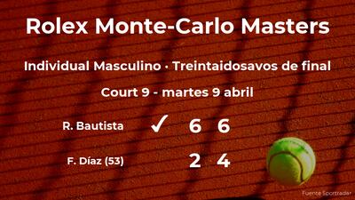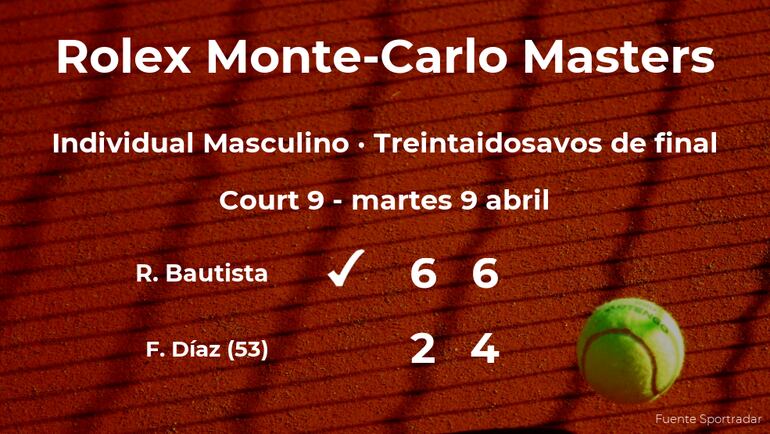 El tenista español Roberto Bautista ganó por 6-2 y 6-4 a Facundo Díaz, tenista argentino, número 53 de la ATP, en los treintaidosavos de final del torneo de Monte Carlo. Con este resultado, seguiremos viendo al ganador del partido en los dieciseisavos de final del torneo de Monte Carlo.