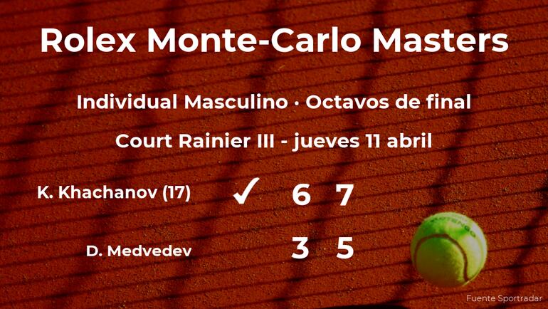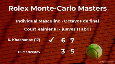 El jugador ruso Karen Khachanov, número 17 de la ATP y cabeza de serie número 15, venció en los octavos de final del torneo de Monte Carlo por 6-3 y 7-5 a Daniil Medvedev, tenista ruso y cabeza de serie número 4. Tras este resultado, veremos al vencedor del partido en la siguiente fase del torneo de Monte Carlo, la siguiente ronda.