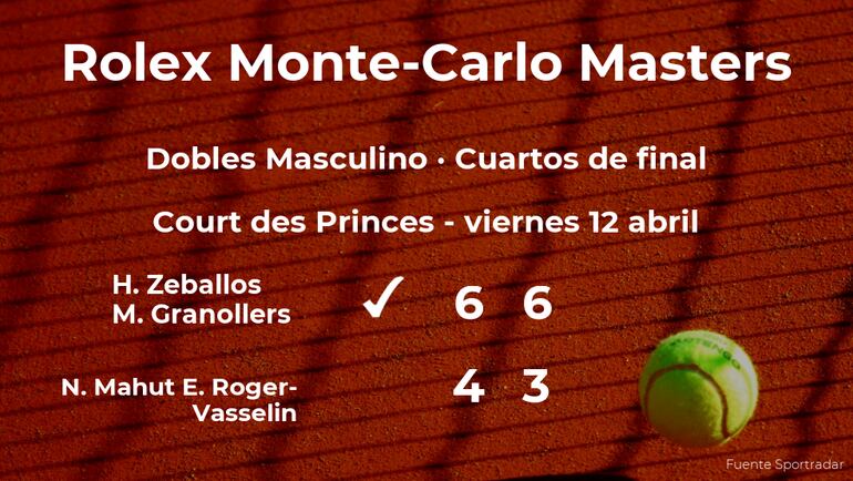 El argentino Horacio Zeballos y el tenista español Marcel Granollers vencieron por 6-4 y 6-3 a los jugadores franceses Nicolas Mahut y Edouard Roger-Vasselin en los cuartos de final del torneo de Monte Carlo. Tras este resultado, podremos seguir viendo a los ganadores del partido en la siguiente fase del torneo de Monte Carlo, la siguiente ronda.
