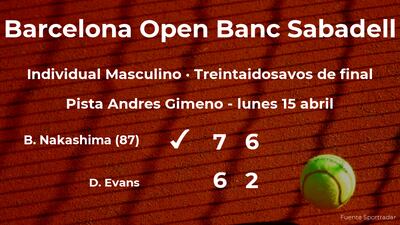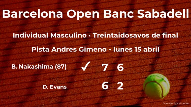 Brandon Nakashima, estadounidense, número 87 de la ATP, ganó por 7(7)-6(5) y 6-2 a Daniel Evans, tenista británico en los treintaidosavos de final del torneo de Barcelona. Tras este resultado, el tenista estadounidense consigue clasificarse para los dieciseisavos de final del torneo de Barcelona.