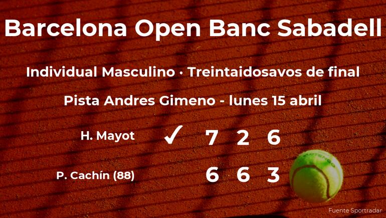 El jugador francés Harold Mayot venció por 7(7)-6(5), 2-6 y 6-3 al argentino Pedro Cachín, número 88 de la ATP, en los treintaidosavos de final del torneo de Barcelona. Con este resultado, seguiremos viendo al ganador del partido en la siguiente fase del torneo de Barcelona, los dieciseisavos de final.