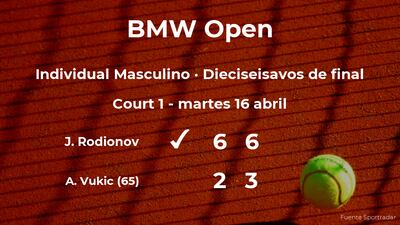 El austriaco Jurij Rodionov ganó en los dieciseisavos de final del torneo de Múnich por 6-2 y 6-3 a Aleksandar Vukic, tenista australiano, número 65 de la ATP. Tras este resultado, seguiremos viendo al ganador del partido en los octavos de final del torneo de Múnich.