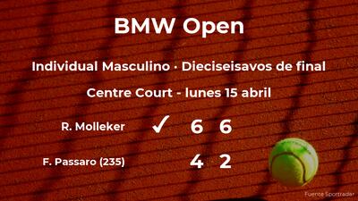Rudolf Molleker, venció por 6-4 y 6-2 a Francesco Passaro, tenista italiano, número 235 de la ATP, en los dieciseisavos de final del torneo de Múnich. Tras este resultado, podremos seguir viendo al vencedor del partido en los octavos de final del torneo de Múnich.