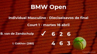 Botic van de Zandschulp, venció por 6-4, 2-6 y 6-3 al tenista ruso Ivan Gakhov, número 280 de la ATP, en los dieciseisavos de final del torneo de Múnich. Con este resultado, podremos seguir viendo al vencedor del partido en la siguiente fase del torneo de Múnich, los octavos de final.