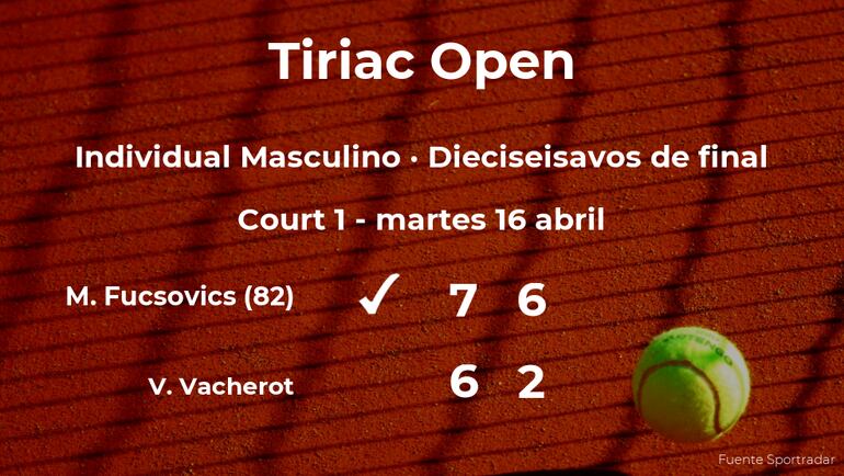 El tenista húngaro Márton Fucsovics, número 82 de la ATP, ganó en los dieciseisavos de final del torneo de Bucarest por 7(10)-6(8) y 6-2 a Valentin Vacherot, tenista. Con este resultado, el húngaro consigue clasificarse para los octavos de final del torneo de Bucarest.